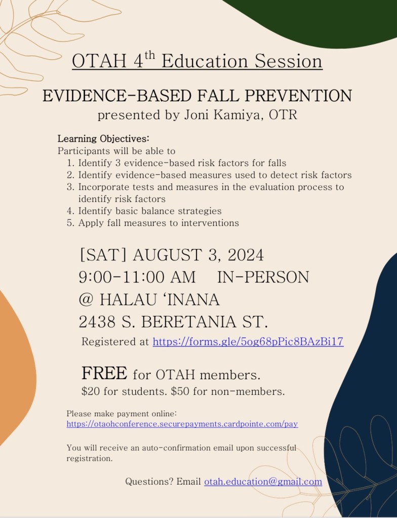 OTAH is collaborating with Hawaii Pacific OTD program for our first in-person conference on October 5, 2024 from 8:30 to 5:30 at Aloha Tower Sunset Ballroom. We will be having a variety of speaker tracks, vendors, and our annual meeting, and lots of time to network with your fellow OTPs!